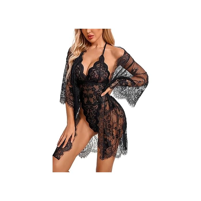 Avidlove Women Sexy Lingerie Set 2 Piece Lace Kimono Robe with Lace Teddy Lingerie Bodysuit