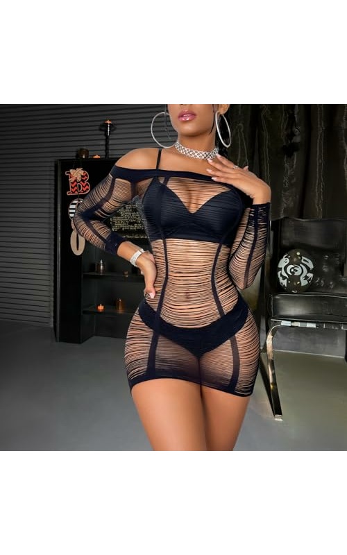Black Sheer Mesh Fishnet Lingerie Set for Women,Black Halloween Sheer Fishnet Teddy Lace Bodystocking