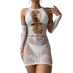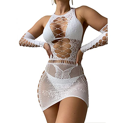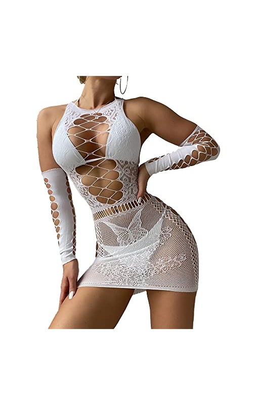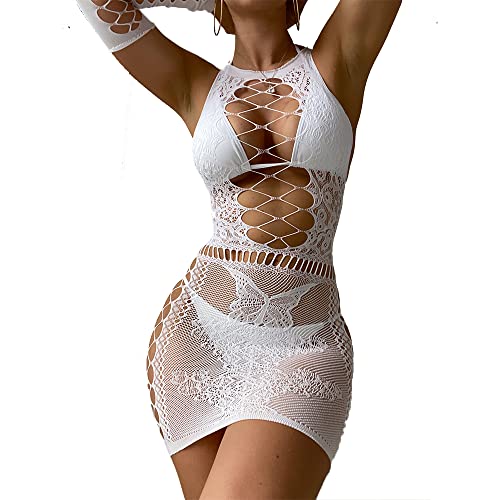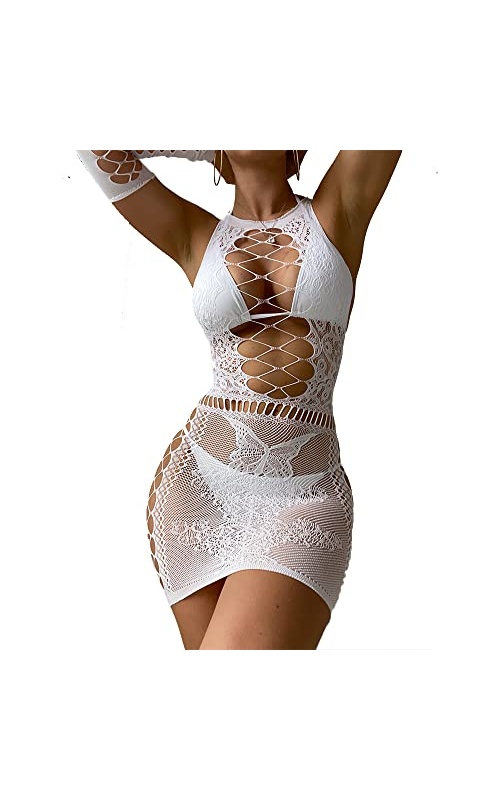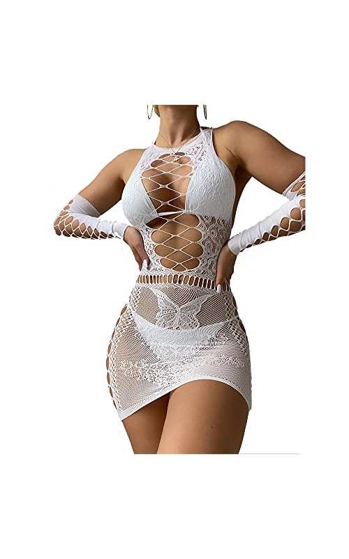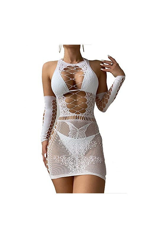 Jenaforte Fishnet Cover Up Off Shoulder Hollow Out Bodysuit Sexy Teddy Lingerie Mesh Mini Dress For Women