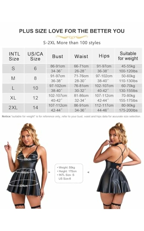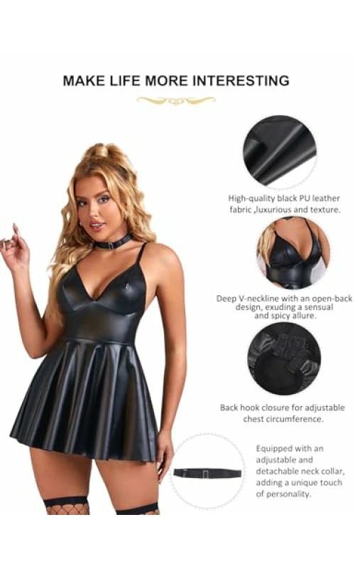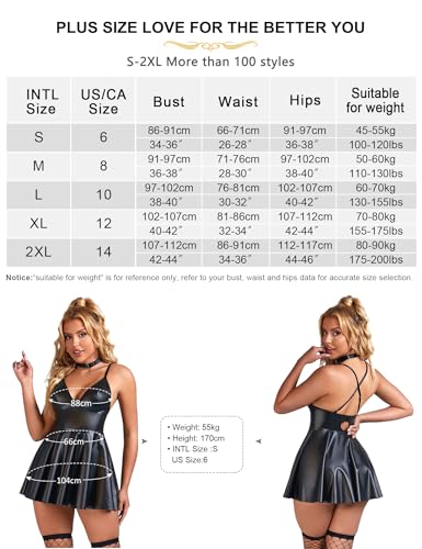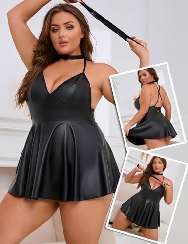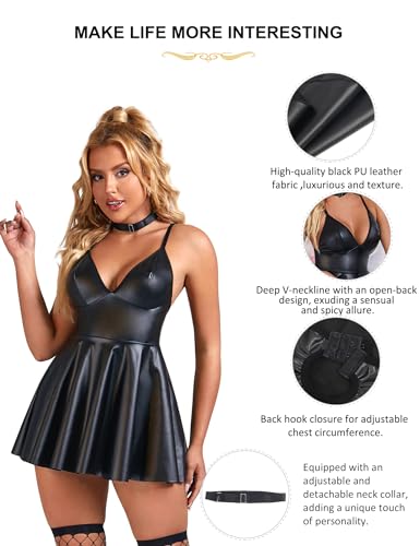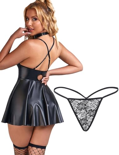 ohyeah Faux Leather Lingerie Set for Women Plus Size PU Lingerie V Neck Backless Babydoll Chemise Mini Lingerie Dress;G String Thongs for Women