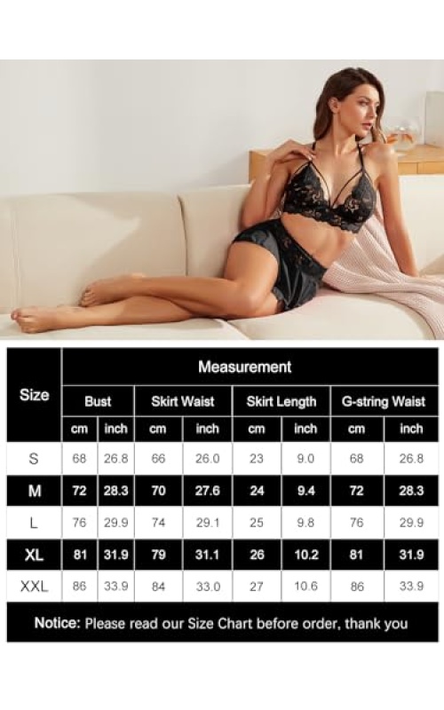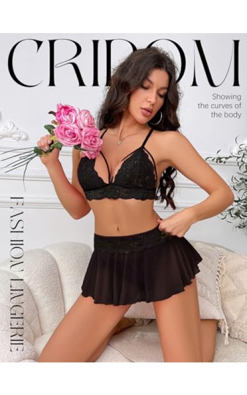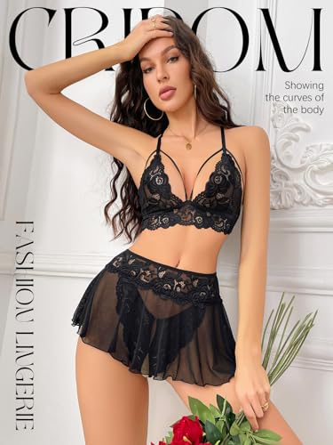 CRIPOM Sexy Lingerie for Women Naughty 3 Piece Lace Bralette, Mini Skirt with G-String Crotchless Lingerie Outfits