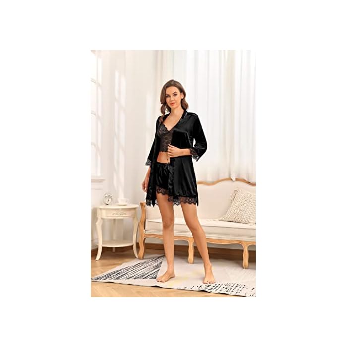 ESKTJH Women’s Pajama Satin Sexy Lingerie Robe Set 4Pcs Pjs Silk Sleepwear Lace Cami Shorts Loungewear