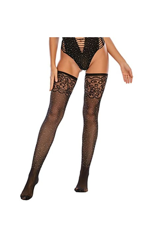 FANCAME Womens Sparkle Thigh High Stockings Patterned Floral Black Stockings Rhinestone Stay Ups Socks Tights